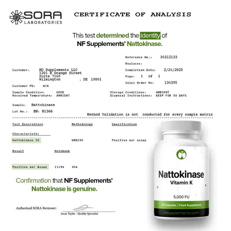 Every batch of our Nattokinase is independently tested by SORA Laboratories to confirm identity, potency, and purity. While most brands never verify what's in the bottle, we provide third-party proof that you're getting exactly what the label promises - and nothing you don't.